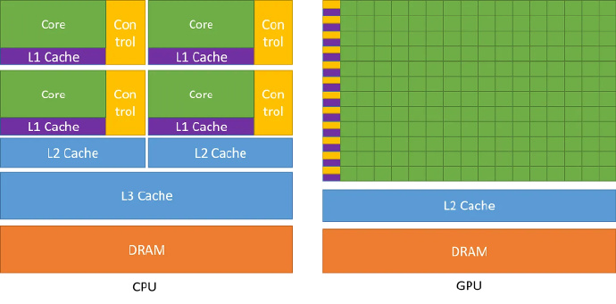 通过上面在CPU上实现的的矩阵操作,特别是一个简单内积运算需要多层for循环嵌套,大家就知道,在CPU上这种为逻辑控制转移设计的架构,其实并不能很好地实现并行运算。而矩阵运算的行列其实是可以并行的,所以深度学习依赖的矩阵运算在CPU上是极其低效的。为了更直观地对比可以参考下图,相比于CPU,GPU的控制逻辑单元较弱(蓝色单元),但是具有大量的ALU(算术逻辑 绿色单元)。