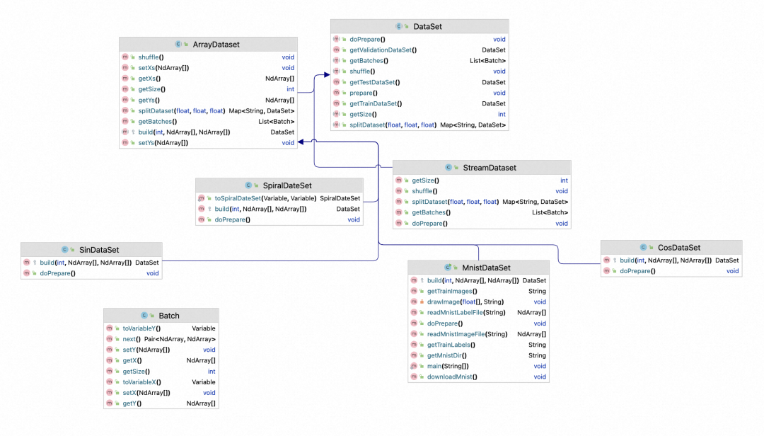 DataSet组件定位为数据的加载和预处理转化成模型可以学习的数据格式。目前一些简单数据源实现,都是基于数据可以一次装载到内存的实现(ArrayDataset),例如SpiralDateSet以及MnistDataSet等。