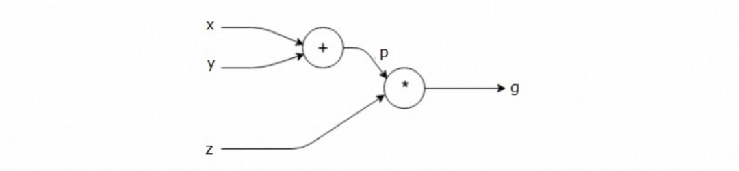 计算图具有加法节点(具有“+”符号的节点)和乘法节点,其具有三个输入变量xyz以及一个输出g。