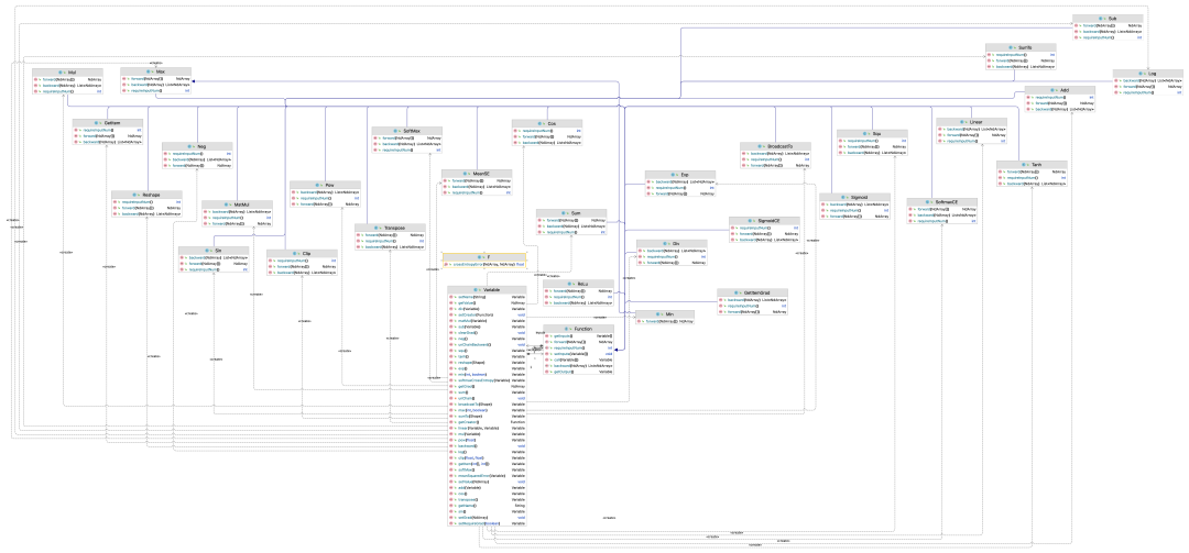 Variable 的是实现如下,表示数学中的变量的抽象,其中backward 是反向传播的入口函数。