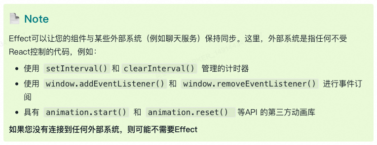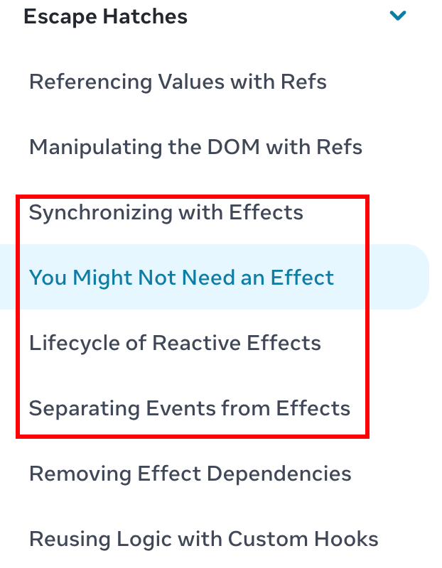在React官方文档的ESCAPE HATCHES章节中,我们发现effect占据了一半的文档,这个章节翻译成中文是逃生舱口,只有在危险的时候才会进入逃生舱口,effect亦是如此,只有在不得已的时候将其作为最后的逃生舱。