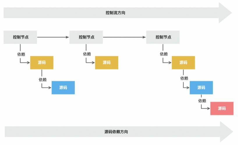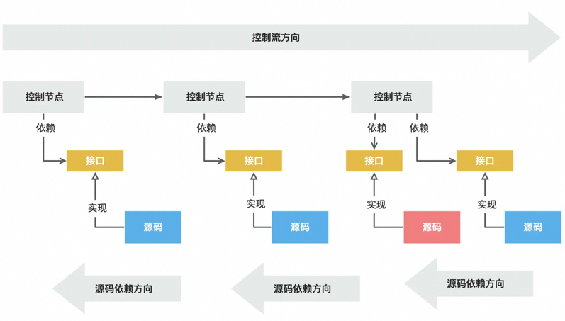- 控制流与实现细节无关, 对于控制流中的任意流程节点,无论你如何实现它,流程节点的目的和意义都不会发生变化。例如对于用户详情查询控制流中的“查询用户基本信息”节点而言,无论你的实现细节是从缓存中查询还是从数据库中查询,其目的就是“输出用户信息交付给控制流下一流程节点”,不会随着存储源的变化而发生改变。
