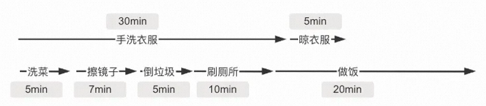 答案比较显而易见,我们只要努力让两个人做家务的时间尽量相等,那么总体时间就是最少。简单排列组合后,不难得出答案为42min(任务的最小排列组合方式不止1种)