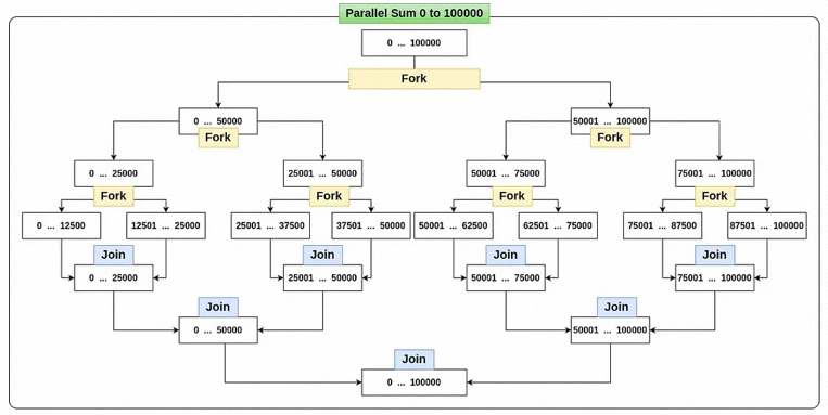 fork/join 池以递归方式划分较大的任务,直到可以按顺序计算子任务而不会进一步分解。在任务完成执行后,它们返回结果,这些结果被连接回来,然后返回最终结果。下图是并行计算0~100000的fork-join示意图。
