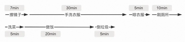 其中晾衣服必须在手洗衣服完成后才能做,做饭必须在洗菜完成后才能做。并且同一项工作最多只能一个人操作。