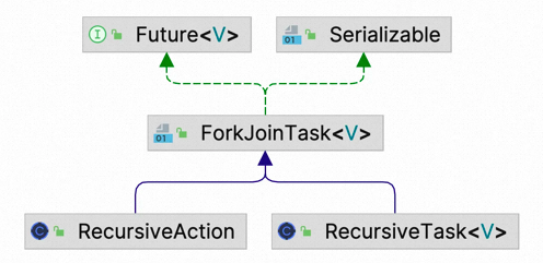 在实践中,使用ForkJoin框架,必须首先创建一个ForkJoinTask任务。它提供在任务中执行fork()和join()操作的机制。通常情况下我们不需要直接继承ForkJoinTask类,而只需要继承它的子类,Fork/Join框架提供了以下两个子类: