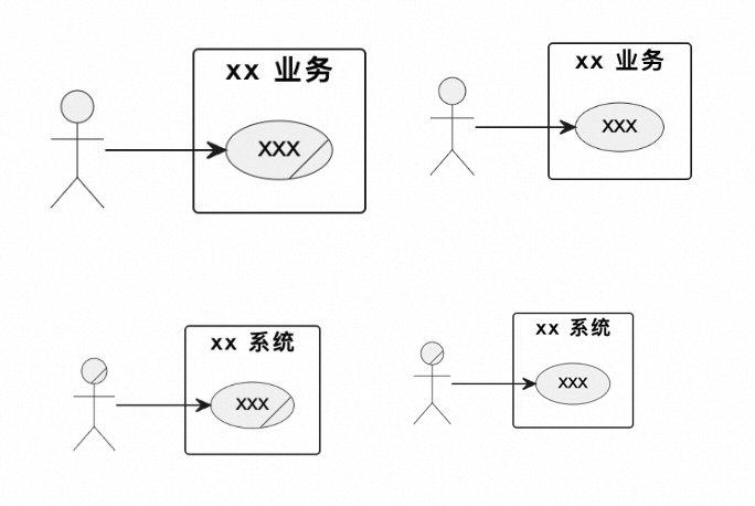 没错,两个图的最大的不同就是有无“/”,业务用例图在业务执行者和业务用例上是有“/”的,系统用例图在系统执行者和系统用例图上没有“/”,就是这么简单。所以现在再看到下面这个几个图,你是不是可以一眼看出其中的问题了。