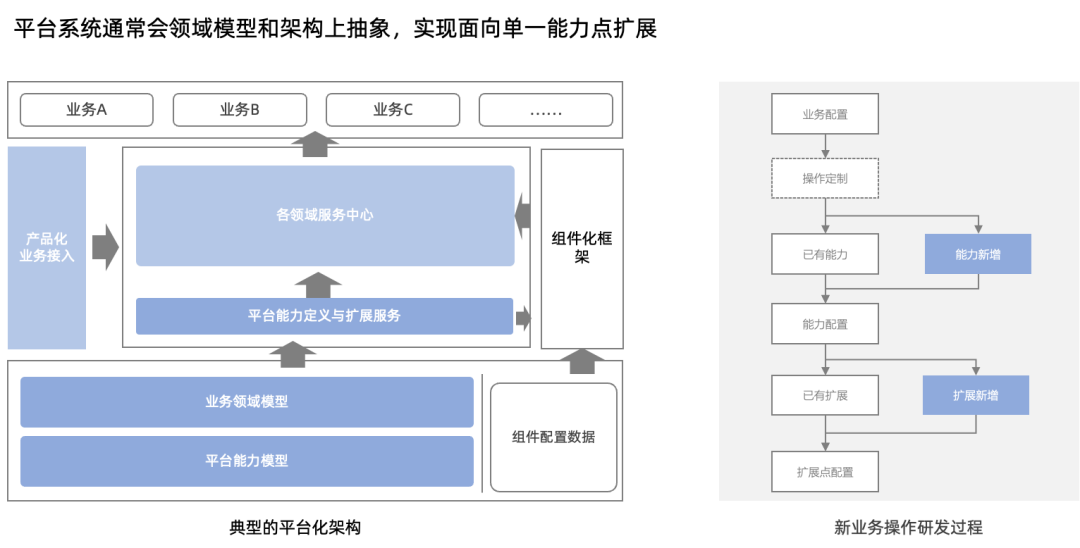 针对业务复杂性和迭代效率的要求,平台化的架构起了关键的作用。整个营销支撑体系进行了合理的领域划分,上面提到的几个业务域,都形成了各自的平台体系,例如招商平台、投放平台、权益平台、搭建平台等。从大的建设思路去看,平台系统核心通过领域模型标准化和业务流程的抽象,实现80%~90%的系统功能的复用,同时架构上实现单一能力点的扩展以提高迭代效率。