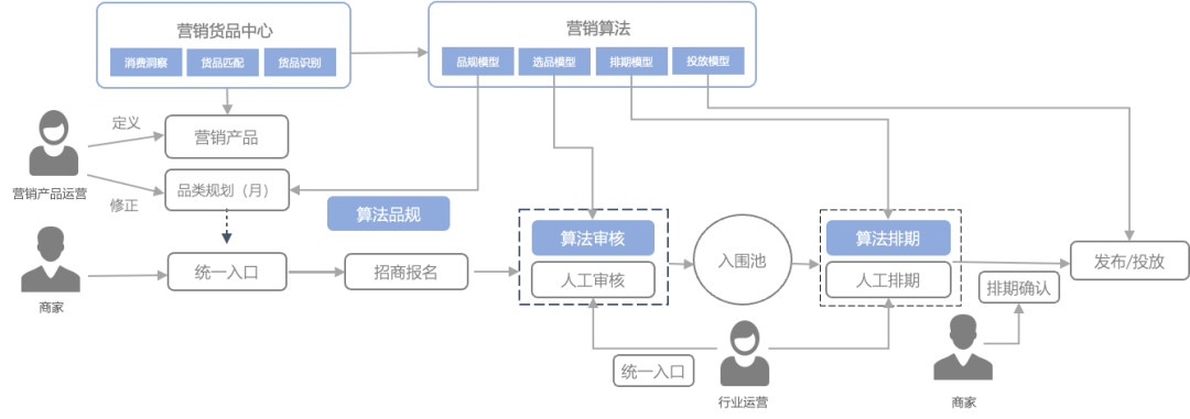 最后经商家确认后,完成排期确认最终到用户端生效。最后,在营销产品正式售卖结束后,整体运营效果,反馈到算法品规、算法审核、算法排期等环节形成反馈链路。