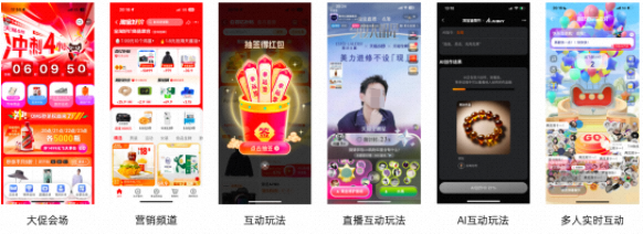 组成业务场景的是一系列的产品,包括会场、频道、互动玩法、直播营销组件。