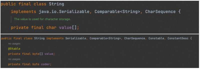 同时,String类的内部还引入了一个名为coder的byte类型的字段。这个字段是用来标识存储在byte数组中的数据是何种字符编码的。在新的String类的实现中,存在两种可能的字符编码:ISO-8859-1(一个字符占用一个字节)和UTF-16(一个字符占用两个字节)。对于ISO-8859-1编码的字符串,coder的值为0,而对于UTF-16编码的字符串,coder的值为1。这样,通过检查coder字段的值,就可以知道存储在byte数组中的数据应该使用什么样的编码方式进行处理,从而避免了因为字符编码不同而导致的处理错误。