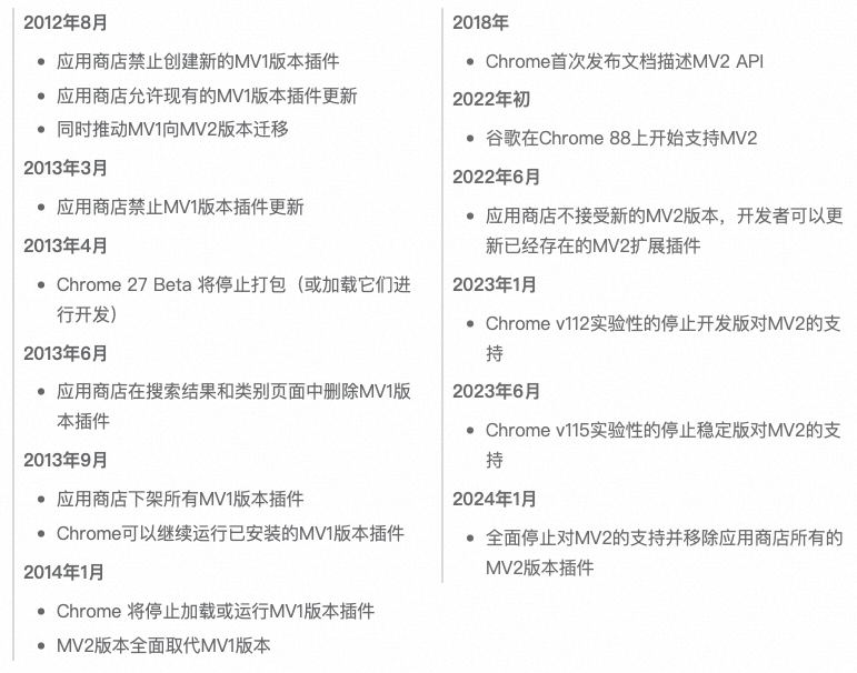 - Chrome插件MV2版本将在24年1月全面废弃,需要尽快迁移至MV3版本。