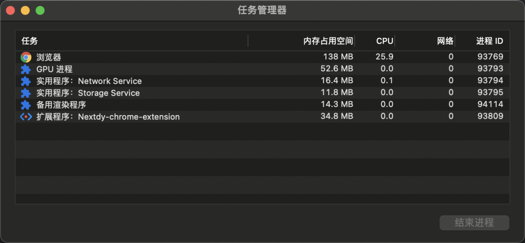 - 可以看到运行了6个进程,分别是浏览器进程、GPU进程、网络进程、存储进程、渲染进程和扩展进程。