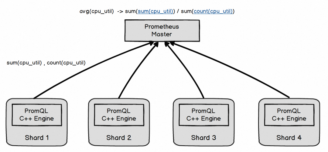 为此我们在PromQL的计算逻辑上,引入了一层并行计算架构,将大部分的计算量分布到Worker节点,Master节点只做最终的结果聚合,同时计算并发数和Shard数解耦,存储和计算都可以独立缩扩容。整体的计算逻辑如下: