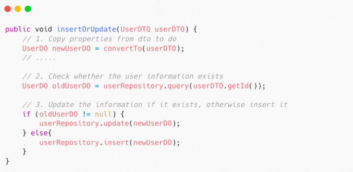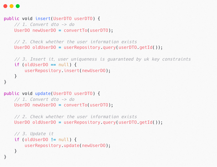 举个例子,偶尔会看到我们在业务层代码中,部分同学会把简单的新增和修改逻辑抽象为一个方法,美其名曰「提供给接入层复用」,如下面的 insertOrUpdate 方法中,初看是复用了领域对象转换和用户对象是否存在的代码,符合 DRY 原则,但实际上却是混用了两个不同的业务语义,会给后续的维护带来较高的成本,如变更用户信息时,需要做更个性化的用户属性处理,这时候调整领域对象转换处的代码,将会影响新增逻辑。