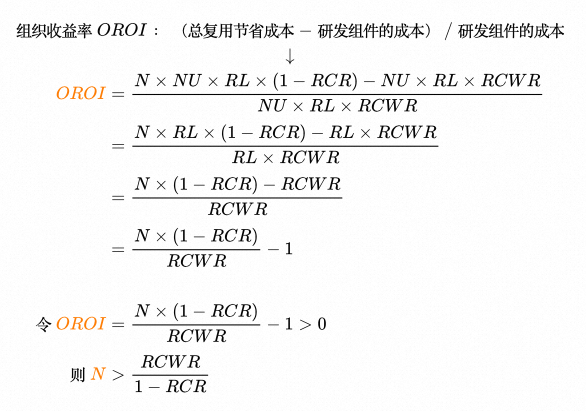 对于组织而言,假如某可复用组件的N个场景被使用了,则组织复用收益 OROI 可计算如下: