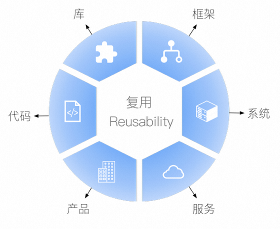 软件复用可以在不同粒度上进行,包括代码和设计拷贝、源代码复用、设计和软件体系结构复用以及领域特定的软件体系结构复用等。早期的软件复用主要集中在代码级别,例如共享方法、抽象类、库、微服务和Docker镜像等。随着时间推移,其外延拓展至领域知识、开发经验、设计文档、需求分析和测试用例及数据等在不同阶段所产生的各种软件产品。在本文中,除非特别说明,复用性主要指的就是聚焦代码的复用,下文中的「组件复用」,不仅限于通常我们认知中的公共库,还包括代码方法、公共类、软件框架、可集成系统等软件开发中的可复用元素。