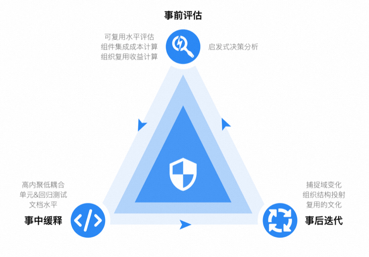 为了最大程度的降低复用带来的风险,本文提出一套从类比于安全风险管理的「复用性风险」应对模型,从事前评估、事中缓释、事后迭代三个阶段出发,最大程度地降低我们在开发可复用组件、使用可复用组件中遇到的各类风险。需要说明的是,上面以及后面指的「复用性风险」,定义为「由于不合理的复用决策,导致依赖和复杂度膨胀过快,从而导致软件维护成本过高」的问题,除了成本风险外,由于复用组件的不合理使用或存在的缺陷而导致的兼容性、安全性、性能等方面的风险,其风险更为显著和易于治理,因此不是本文论述的重点。此外,复用开发过程中的开发目标偏移、迭代和发布计划的延期、人员短缺等风险,限于篇幅也不在这里展开。