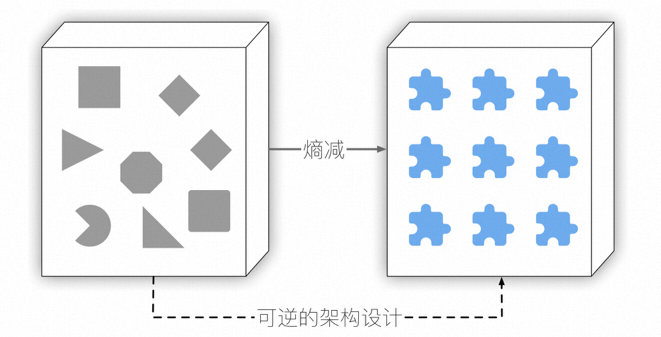 是否有一种指导原则,可以让我们在跟踪这些域变化的时候,进行更合理的设计与取舍呢?熵增原理告诉我们:一个孤立的热力学系统的熵不减。对于系统的可逆过程熵不变,不可逆过程熵增加。因此,类比软件工程领域,在组件的事后迭代阶段,一个尽可能消除代码设计/软件架构中熵增的设计原则:在既有组件中新增的功能点需要存在逆向的删除机制,这样就可以尽可能让可复用组件跳出逐渐混乱无法维护的宿命。功能可逆的具体操作具体可以表现为:SPI 机制(Service Provider Interface )、面向接口的编程、通过模块隔离随机的或一次性的需求等。