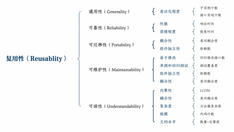 我们在设计一段代码/一个类/一个模块等可复用的组件时,一些可衡量的软件指标共同决定了组件的可复用性水平的高低。这些指标包括:可靠性(Reliability)、可读性(Understandability)、可维护性(Maintainability)、通用性(Generality)与可迁移性(Portability),如下图所示。每一个指标可由各类代码度量属性决定,如组件的可迁移性由「组件的独立性」和「耦合性」两个属性决定,大部分的度量属性都是可以通过形式化定义并计算出来。不同指标的决定因子及度量值(括号中)如下: