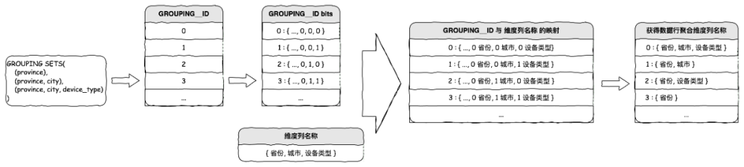 对于 GROUPING__ID 递增数列中的每个数值,将该数值的 2 进制每个比特位与维度名称序列的下标进行映射,输出所有对应比特位 0 的维度名称。例如: