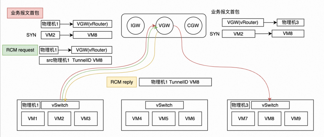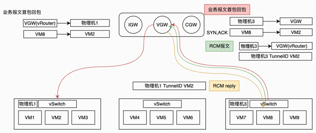 当物理机内的虚拟机创建成功后,开始对VPC内的其他虚拟机进行请求,这里用TCP请求举例,由于第一时间没有表项的存在,TCP报文的SYN报文会转发给VGW(vRouter Gateway),因为物理机中没有虚拟机远端的表项,这个SYN报文发送的同时会发送一个RCM request请求报文,报文的Payload载体包含源物理机IP、VPC的Tunnel ID、目的VM的IP地址,VGW收到业务的SYN报文后会直接转发给远端的物理机,在收到RCM request报文时候,会将目的物理机的IP地址返回给源物理机,源物流收到后,会将该信息更新到自身的表项中,回程的报文同理,当目的物理机收到源的SYN请求后,目的虚拟机响应的[SYN,ACK]报文会发送到VGW,同时发送RCM request请求来获取对端的信息,当收到VGW的RCM reply后,会将源端的物理机IP地址保存在自身的表项中,后续的业务交互就无需VGW参与,两侧的物理机直接进行通信,完成流量的下沉。