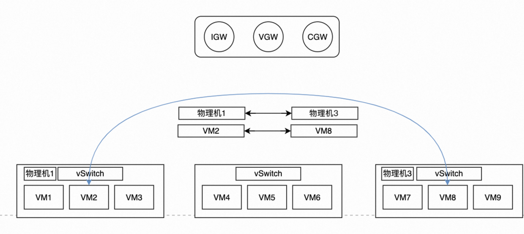 在专有网络中,上层云网络淡化了底层物理网络的框架和架构,而是通过虚拟交换机和虚拟网关两部分来定义整个转发平面,因此可以简化成所有要和网关进行通信的流量都是南北向的,而无需经过网关直接交互的流量是东西向的,这样的网络转发也带来了新的问题,比如当VM和VM之间需要直接通信,因为在云网络里面所有的VM都是虚拟出来的,在VM的不存在远端真实的MAC地址,而所有的MAC地址都是物理机上面的ARP Proxy代理后直接返回给VM的,所以在云网络中VM之间的之间通信在物理网络中都是封装在三层之上的,这导致了物理机之间几乎没有直接互访的流量,所有的流量都转发到了虚拟路由器所在的网关上进行转发,由虚拟路由器提供中转。