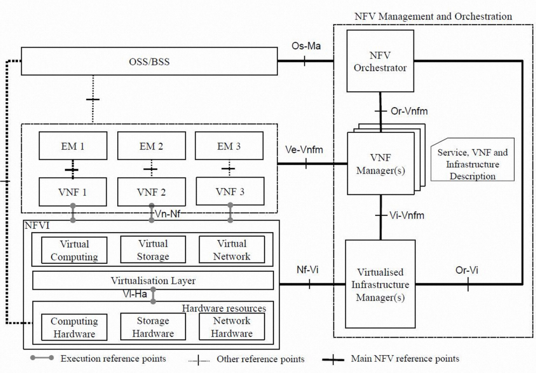上图是ETSI发布的一个NFV参考框架,左侧从下到上可以分为三层,最下面是基础设施层,为虚拟化提供物理资源以及虚拟技术的支撑。中间是虚拟功能和对应的EMS系统,网络服务的实际业务处理就在该层中实现,最上面是运营支撑层,也就是运营商的OSS/BSS系统。右侧是NFV中的核心,主要负责编排和管理。可从图中看到这块由三个模块构成:NFVO、VNFM、VIM。NFVO负责NS的编排、VNFM和VIM的管理。VNFM负责管理VNF的生命周期,并对VNF进行监控,VIM负责管理虚拟化的基础设施。