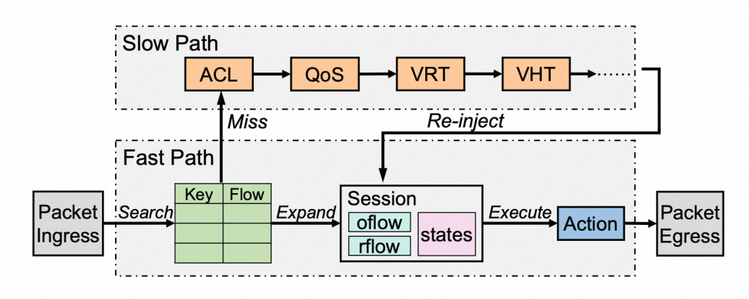 NFVO层根据业务网元注册的网络拓扑,为业务网元编排分布式的快慢速节点,并且阿里云NFVO层设计实现了一套分布式的快慢速转发架构,在实现上用两层ECS组成,Fastpath ECS无状态的转发层,有Slowpath ECS下发offload转发规则,一台流首包miss到Slowpath处理,Slowpath根据逻辑规则下发flow到快转后,后续所有业务流量转发到Fastpath后直接进行业务转发,采用这样的架构业务网元仅需要专注于网络本身的业务逻辑处理,即只需要关注首流的处理,其它复杂逻辑比如分布式的Session同步和后续报文的匹配规则和逻辑转发全部交由NFV平台处理。