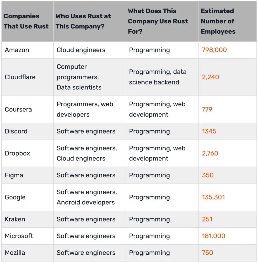 从下图中可以看到,很多知名公司都开始在团队中使用 Rust: