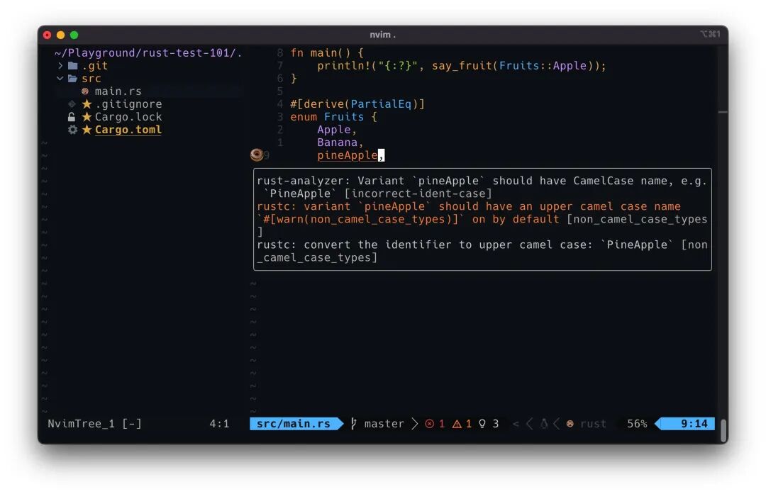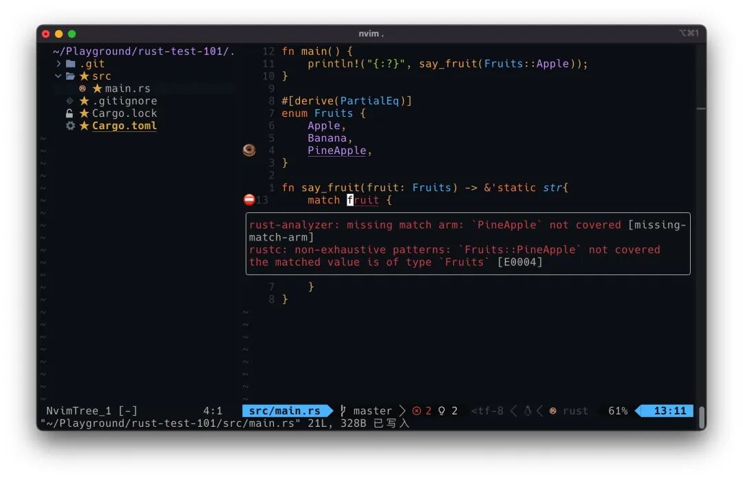 下面我使用了我喜欢的 nvim 编辑器编写了一段 Rust 代码,这段代码声明了一个枚举类型 Fruits,并声明了一个函数打印出对应的水果名称。