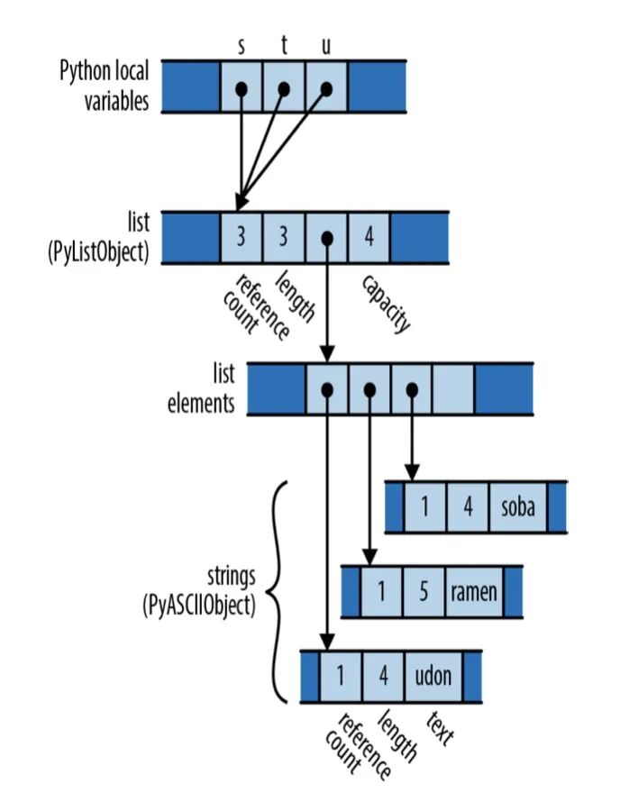 从图中可以看出,变量 s 在内存中存储着一个指向 list 的指针,这个指针指向的对象占用 4 个 memory slot,分别是:
