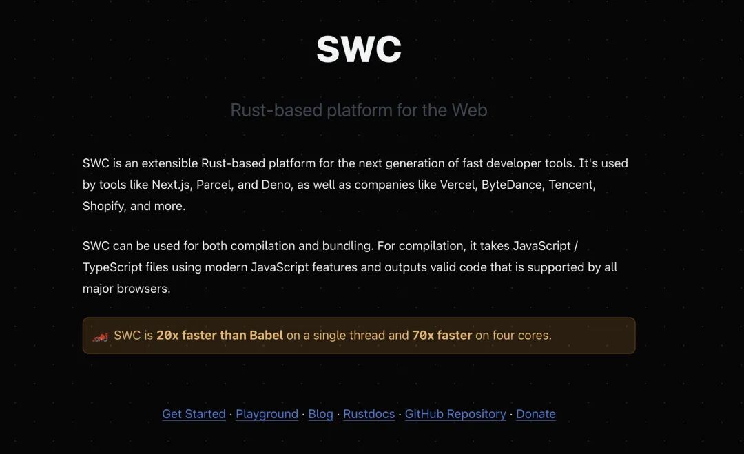 例如 SWC 就在其官网宣称在单线程上的执行速度是传统代码转译工具 Babel 的 20 倍。如果在 4 核设备上开启并行计算,其执行速度将是 Babel 的 70 倍!