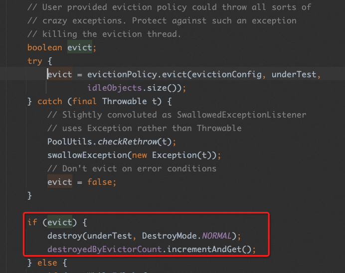 仔细看如下参数值, destroyedCount与destroyedByEvictorCount的值相同, 也就是说这次全都是因为 Evictor 导致. 与上篇文章中解决的因为 池子里Idle连接的数量 导致销毁的原因是完全不同的. 那我们接下来分析下Evictor的逻辑: