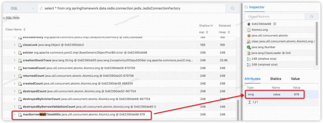 • JedisPool详细信息如下,获取连接最大等待耗时仍然在900ms以上: