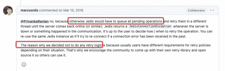 总结下来就是, 如果为了实现上述方案,Jedis需要在内部维护一个Command队列,便于在Jedis对于连接重建之后将这些失败/未执行的Command重新执行,否则会导致应用已经提交的Command根本不执行,而应用也压根感知不到Command没有执行! 这个风险显然是不可接受的。所以Jedis会直接把这个链接异常抛出给外层应用,由应用感知并进行自定义的failover操作。