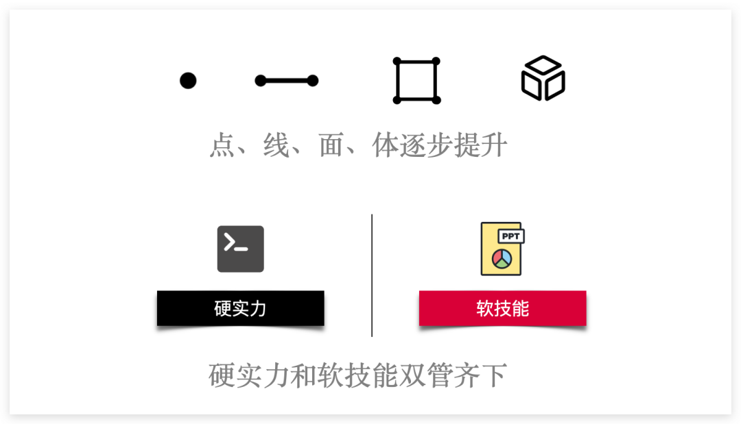 总之,晋升到更高的职级意味着你需要从专注于单一任务(点),到管理整个项目流程(线),再到全面掌握业务和团队协调(面),甚至是跨部门合作,再到跨公司合作(体)等。要求更强的硬件能力(编码能力,专业基础)的同时对软技能(做 PPT 的能力,逻辑思维能力,沟通协作能力)有更好的要求。