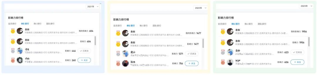 但是,其实每年的难度是不一样的。20 年的时候,钉钉几乎没有人发布文章, 只要随便发布几篇 (哪怕质量没多好),就能成为第一。但是后面开始卷起来了,无数大佬开始发力了,每周似乎都有人上头条,导致我上半年落后了很多,不过下半年还是追回来了。现在要想在钉钉获得 BG 影响第一,则需要在全阿里排名前十了。从阿里的影响力排名中更能看出我这几年的变化: