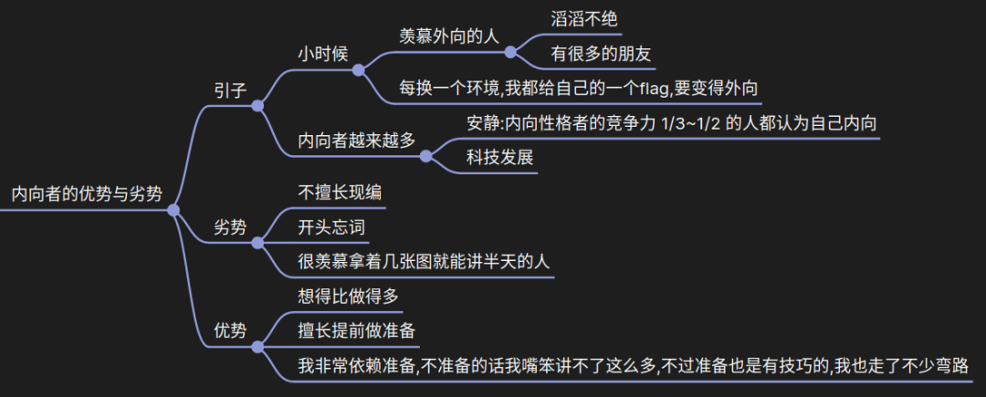 曾经我也陷入过一个误区,很多外向者教导我说 “只要记住你演讲最想说的几句话就行了,其余的即兴发挥即可。”,我也想像他们一样 “帅",就模仿他们,结果现场总是翻车。后来我才意识到,这些外向者的演讲方式,内向者是模仿不来的。内向者因为怕生,反应慢等原因,不适合有太多现场发挥的内容。后来我采用上文中方法准备分享大纲,在大纲的基础上适度地自由发挥,不仅没有限制我的自由,反而发挥地更好了。