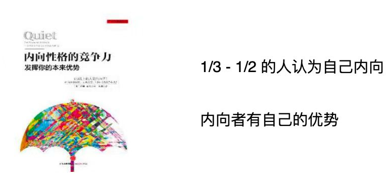 在很久以前读过一本畅销书,名字叫做 《安静: 内向性格的竞争力》。书中提到大约有 三分之一 到 二分之一 的人认为自己内向,作者 苏珊 凯恩 坚定地认为,虽然外向的人在社会上更受到欢迎,但是内向者也有自己的优势。虽然现在看来书里的内容偏鸡汤,但是确实给人带来了信心。