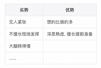 作为内向者,对自己的劣势一直是恨得咬牙切齿。内向者和人沟通时会非常紧张,当众讲话更是紧张得不得了。而且我们不善长现场发挥,是谈话和演讲中的 "冷场王",时常羡慕那些外向的人,对于任何话题都能滔滔不绝谈上好久。现场反应力也不太行,大脑时常转不过弯,别人问了一个问题,需要想好久才知道他在问什么。