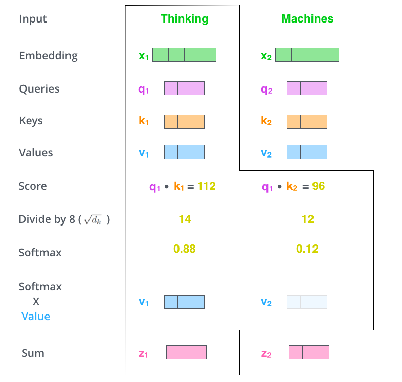 # 乘积意义:给V带上了注意力信息。prob就是下图z(矩阵计算不用在v1+v2)。
