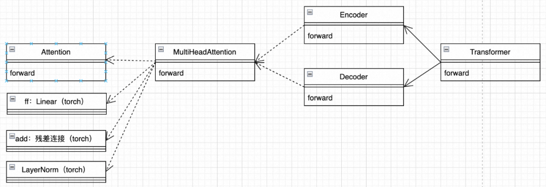 这不是一个技术架构图,上图有很多概念,attention、multi-head等。先尝试转换为面向对象的类图,如下: