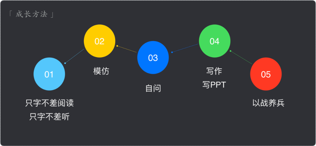5个成长方法中,最锻炼人的是写PPT。PPT的思路,PPT的格局就是你的思路、你的格局。写文章有时候为了写的通俗易懂或字句优美,会把内容写多,但是PPT要把内容写少,经常说能用30分钟讲清楚,不要用1个小时,所以我们团队周会分享都是按30分钟颗粒度组织分享,同时我每周10分钟开场,目标是锻炼用更短的时间去讲清楚一件事,PPT就是这个用处,用抽象,概括,精炼的内容把要讲的内容全部讲清楚,不讲螺旋话,给听众醍醐灌顶的感觉,虽然内容写少了,但是不代表背后的思考少了,反而是基于大量的思考总结概括出来的。