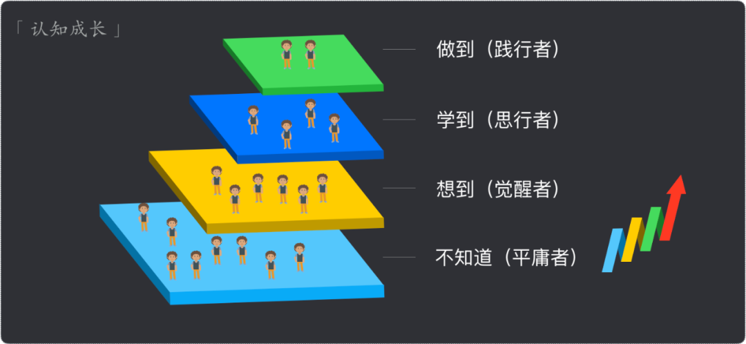 1.认知成长:知道何为成长,自己所处角色是平庸者、觉醒者,思行者,还是践行者;