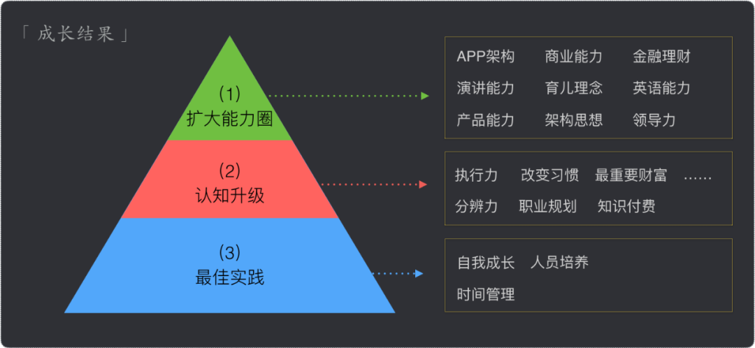 经过1年,2年,更长时间的努力,需要问自己沉淀了什么,沉淀的东西是否是具备专家的水平,在我的成长结果中,我首先沉淀的是认知升级,对我来说,认知就是连接,就是最短路径,认知升级了意味着思维方式的改变,意味着遇到困难时最优解,意味着生活和工作效率的提升。通过认知的变化,让自己完成蜕变,完成突破,沉淀最佳实践,沉淀了自我成长最佳实践、人才培养最佳实践等,往上锻炼出能力,这些领域是工作和生活所需,帮助自己在工作上取得结果,获得认可,是一种外在的表现,比如商业能力、演讲能力、产品思维等。