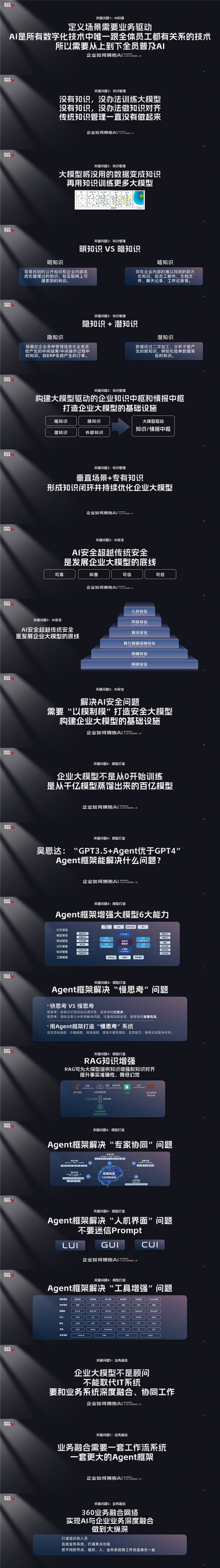 Agent框架。所以我们讲企业做大模型不再是问题,第一知识管理的问题,第二大模型训练中Agent框架的问题,第三业务融合的问题。所以在企业里面打造大模型,并不像大家想象的那么简单。