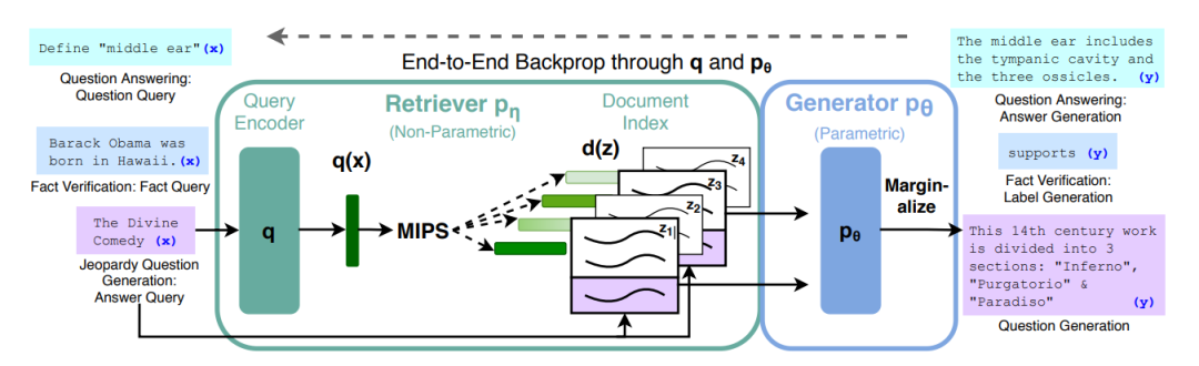 此图是 FAIR 团队的方法概述。结合了一个预先训练的检索器(查询编码器+文档 Index),并进行端到端微调。对于查询 x,作者使用最大内积搜索(MIPS)查找前 K 个文档 zi 对于最终预测 y,并将 z 视为一个潜在变量,并在给定不同文献的 seq2seq 预测上进行边缘化。