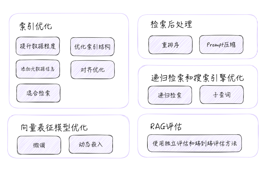 在信息检索和搜索引擎优化领域,通过实施一系列策略可以显著提升检索系统的性能。索引优化通过提升数据粒度、优化索引结构、添加元数据信息、对齐优化和混合检索等方法,可以提高检索的准确性和效率。向量表征模型的优化通过微调和动态嵌入技术,增强了模型对特定领域或问题的理解能力。检索后处理策略如重排序和 Prompt 压缩,进一步提升了检索结果的相关性和用户满意度。递归检索和搜索引擎优化通过递归检索和子查询等技术,实现了更复杂和精确的检索需求。最后,RAG 评估通过独立评估和端到端评估方法,确保了检索系统在各个方面都能满足用户的需求。这些策略的实施,共同推动了检索技术的进步,为用户提供了更加高效和精准的信息服务。