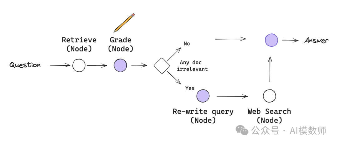 当发现检索的结果都不满足要求的时候,就通过重写问题,再去互联网查询相关的内容,把网上查找的结果再做一次RAG,发送给大模型生成结果。